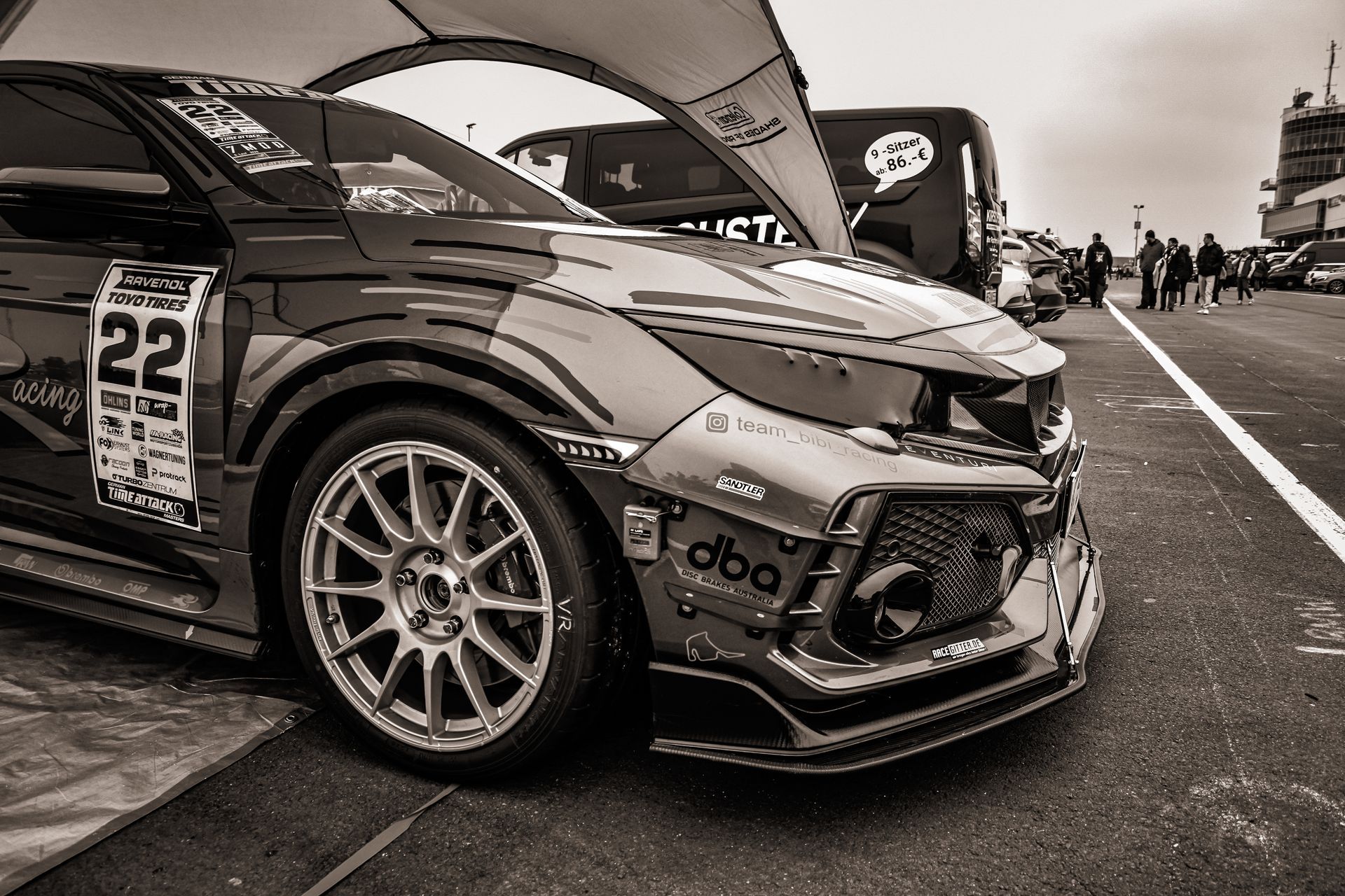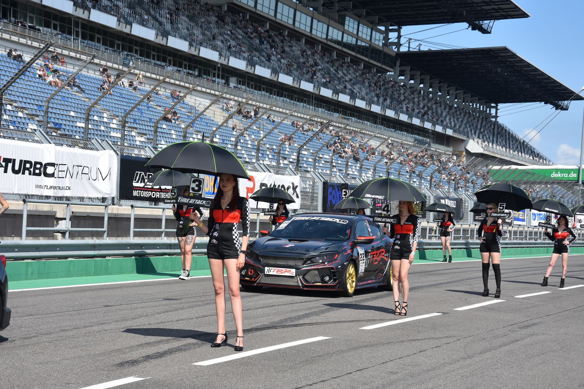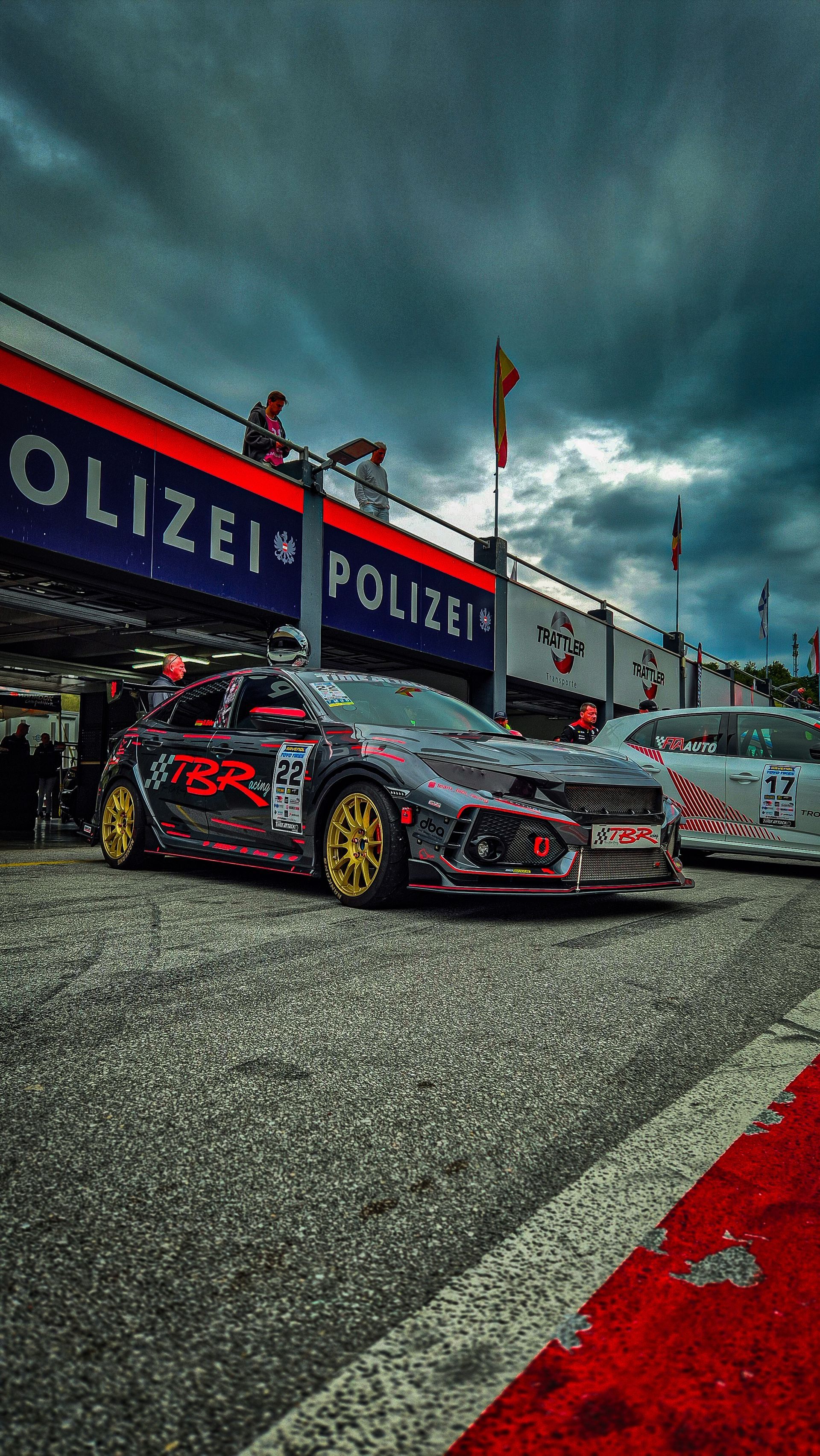 Der Bolide und unser Racegirl zeigten sich von der besten Seite, auch wenn das Training mit insgesamt 9 Runden sicherlich nicht aussagekräftig waren. Am nächsten Tag ging es dann früh ins WarmUp und wieder gab es eine Rotphase. Zur Quali wechselten wir die Reifen und stellten den Boliden auf Yokohama in 255/35/18. Die Quali lief gut, unser Bolide hatte nach der Reparatur des Turbos wieder seine gewohnte Leistung und unser Racegirl konnte sich fürs Finale qualifizieren.
